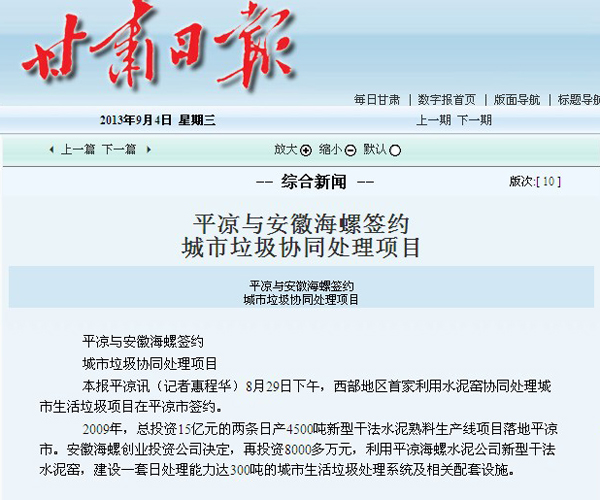 ??? 2009年,總投資15億元的兩條日產(chǎn)4500噸新型干法水泥熟料生產(chǎn)線項(xiàng)目落地平?jīng)鍪?。安徽海螺?chuàng)業(yè)投資公司決定,再投資8000多萬(wàn)元,利用平?jīng)龊B菟喙拘滦透煞ㄋ喔G,建設(shè)一套日處理能力達(dá)300噸的城市生活垃圾處理系統(tǒng)及相關(guān)配套設(shè)施。